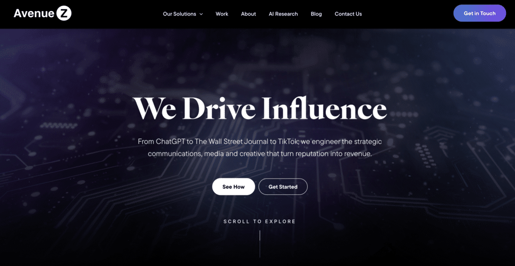 Their approach combines SEO, AI optimization, PR, and entity authority-building to strengthen brand credibility and visibility in high-trust, regulation-heavy markets. Avenue Z focuses on aligning content, brand signals, and off-site authority so AI systems consistently surface their clients as reliable sources.