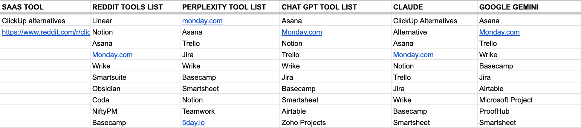 Well-known tools like Notion, Slack, and ClickUp showed up everywhere. But some tools that dominated Reddit threads never appeared in a single AI response, usually because their mentions were buried in posts Google couldn’t crawl or index properly.