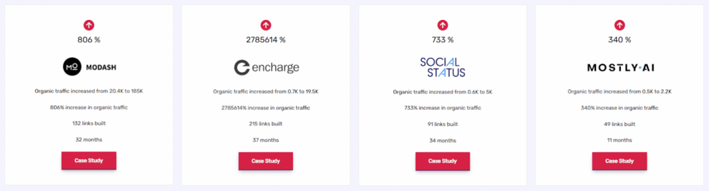 They have helped SaaS companies increase organic traffic and acquire high-quality backlinks that improve search rankings. Some of the key metrics that their case studies showcase: